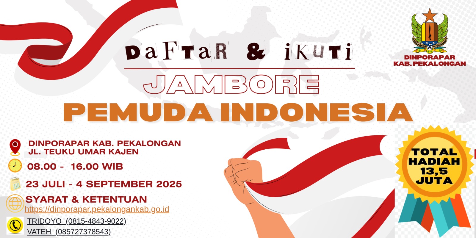 Dalam rangka meningkatkan semangat kebersamaan, kemandirian, dan kreativitas generasi muda, Dinas Kepemudaan dan Olahraga dan Pariwisata Kabupaten Pekalongan menyelenggarakan Lomba Jambore Pemuda Indonesia. Yuk ikuti lomba ini dengan meriah, ada hadiah total Rp. 13,5 Juta lohhh. Jangan sampai ketinggalan!!! Untuk syarat dan ketentuan lebih detail teman-teman bisa download langsung ya dengan klik download tombol di bawah ini :